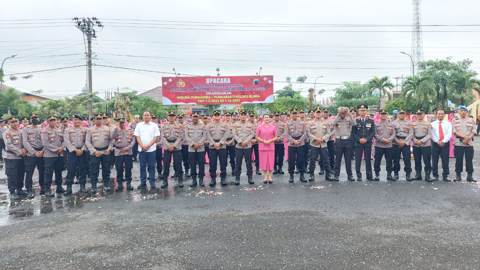 Kegiatan Upacara Laporan Kenaikan Pangkat Perwira dan Bintara Polri Polres Blora TMT 01/01/2023 dirangkaikan Wisuda Purnawira/Purnabakti Polres Blora TMT 01/02/2022 s/d 01/12/2022 itu dilaksanakan halaman depan Mapolres Blora, Polda Jawa Tengah pada Selasa (3/1/2023).