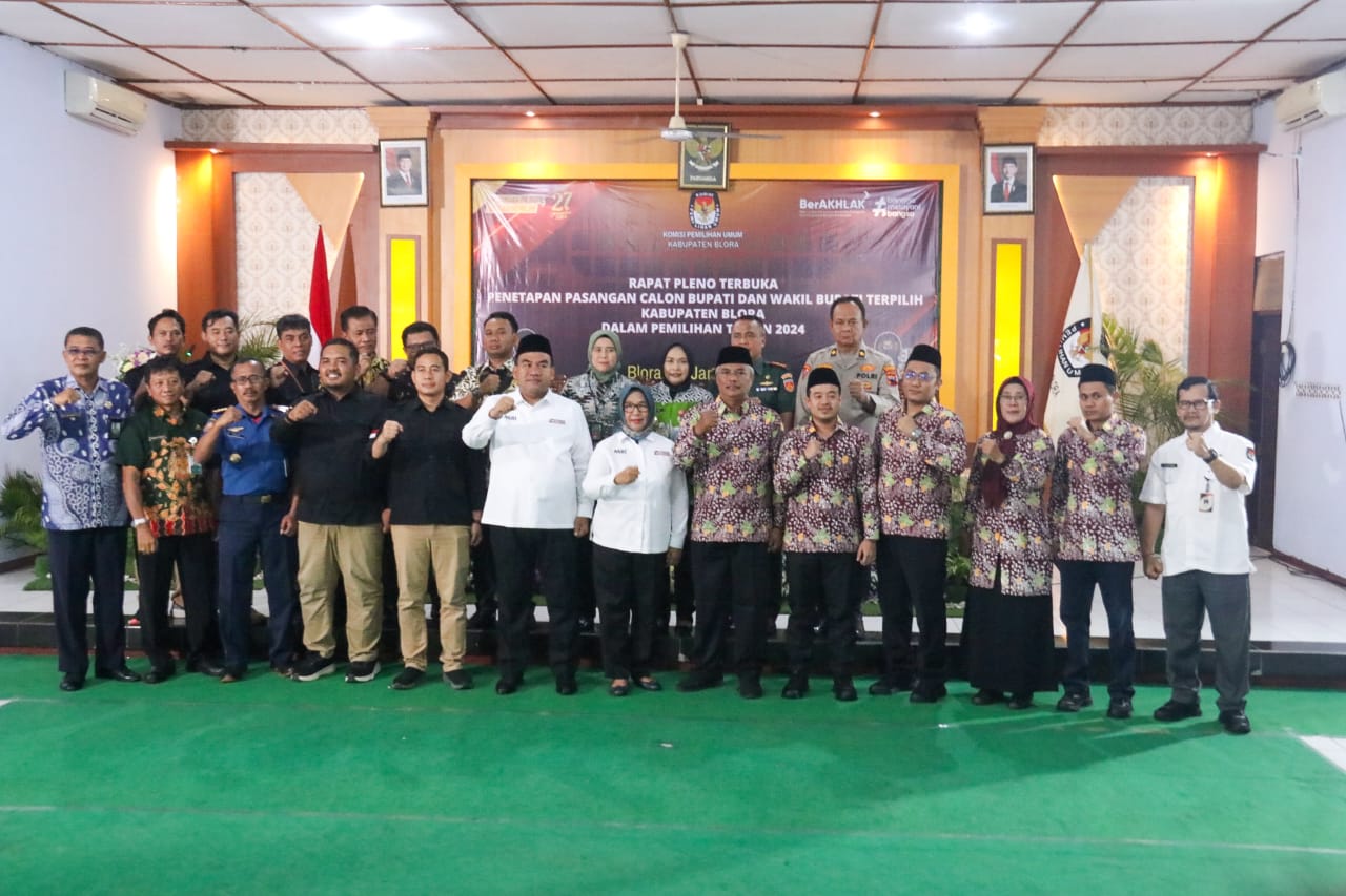 Penetapan tersebut dilakukan dalam acara rapat pleno terbuka penetapan pasangan calon bupati dan wakil bupati Kabupaten Blora dalam pemilihan tahun 2024, yang digelar oleh KPU Kabupaten Blora, Kamis pagi (9/1/2024) di Aula Gedung PKPRI Blora, dengan dihadiri oleh Forkopimda Blora, Bawaslu Blora, dan perwakilan partai politik.