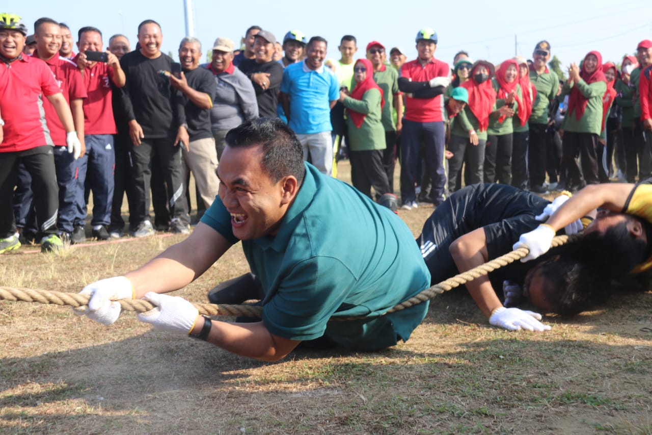 “Sangat menegangkan ikut lomba tarik tambang. Saat melawan regu Kepala OPD, saya bersama Forkopimda lainnya harus gelimpungan untuk adu otot,” ucap Bupati Arief, seusai laga.
