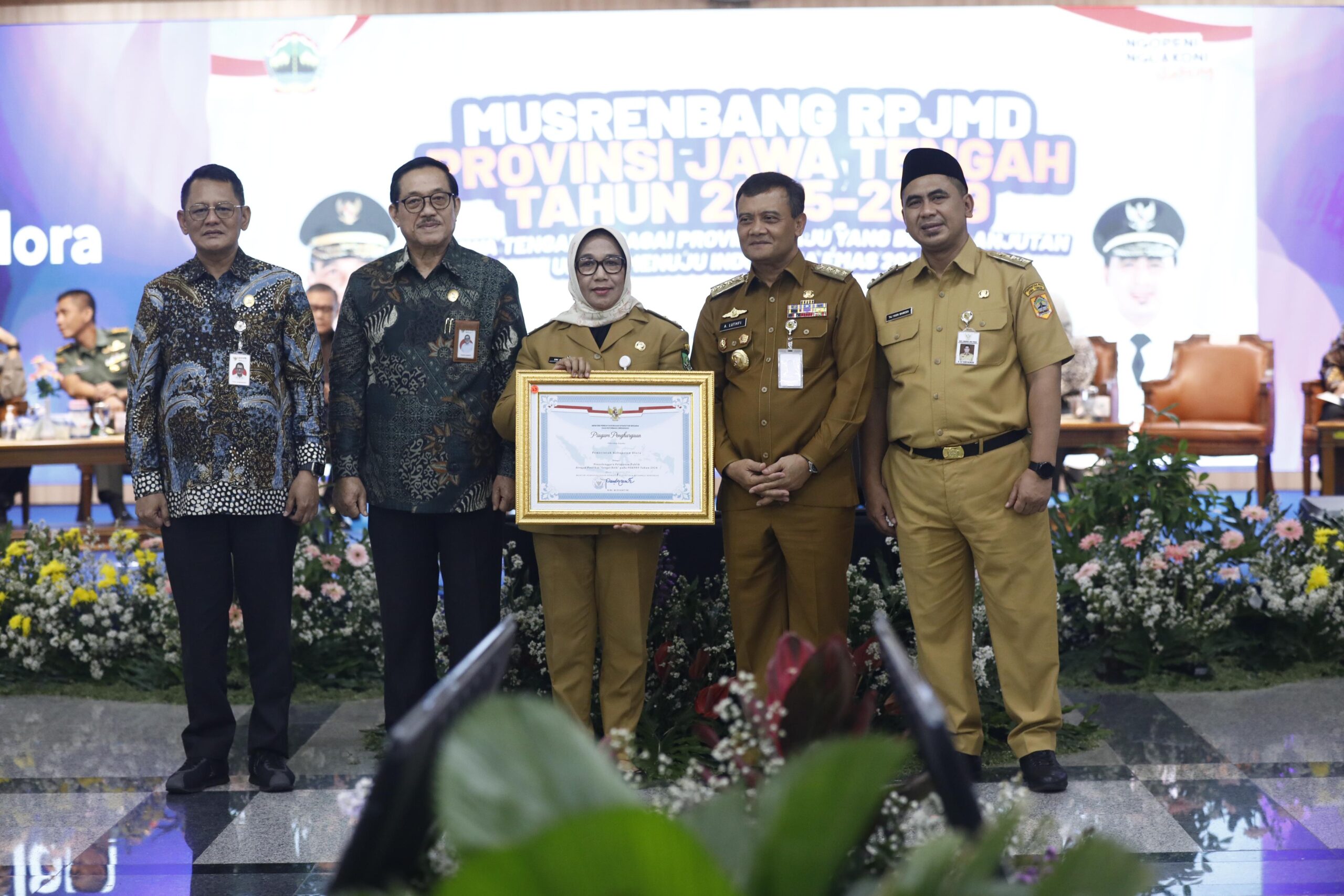 Penghargaan diserahkan oleh Deputi Bidang Pelayanan Publik Kementerian PAN RB, Dr. Otok Kuswandaru, mewakili Menteri PAN RB, Rini Widyantini, kepada Wakil Bupati Blora, Hj. Sri Setyorini, dalam forum Musrenbang RPJMD Jawa Tengah 2025-2030, yang dilaksanakan di Gedung Gradhika Bhakti Praja Semarang, Gubernur dan Wakil Gubernur Jawa Tengah, pada Senin siang (5/5/2025).