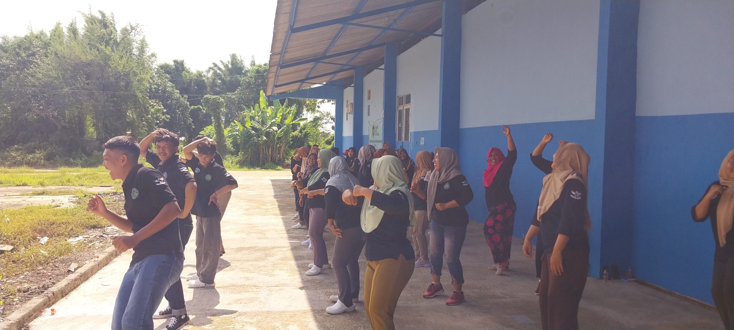 Para relawan tampak mengikuti instruksi gerakan senam di lokasi kegiatan. Agenda ini diharapkan menjadi sarana refreshing di tengah padatnya rutinitas operasional dapur umum.