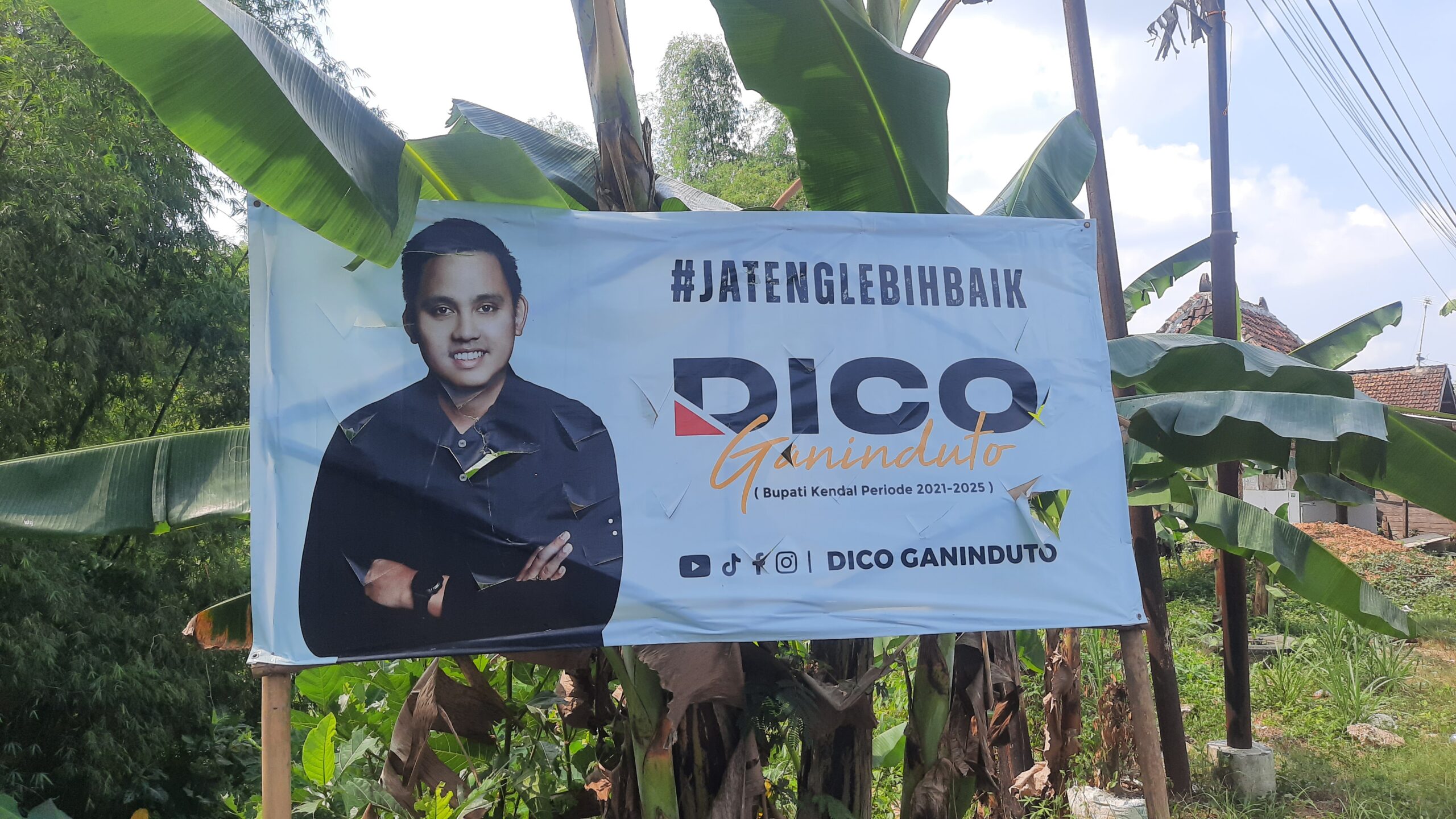 Dalam banner yang bertebaran tersebut, tergambar wajah setengah badan dan nama Dico Ganinduto, sebagai bupati Kendal periode 2021-2025, dilengkapi hashtag jatenglebihbaik.
