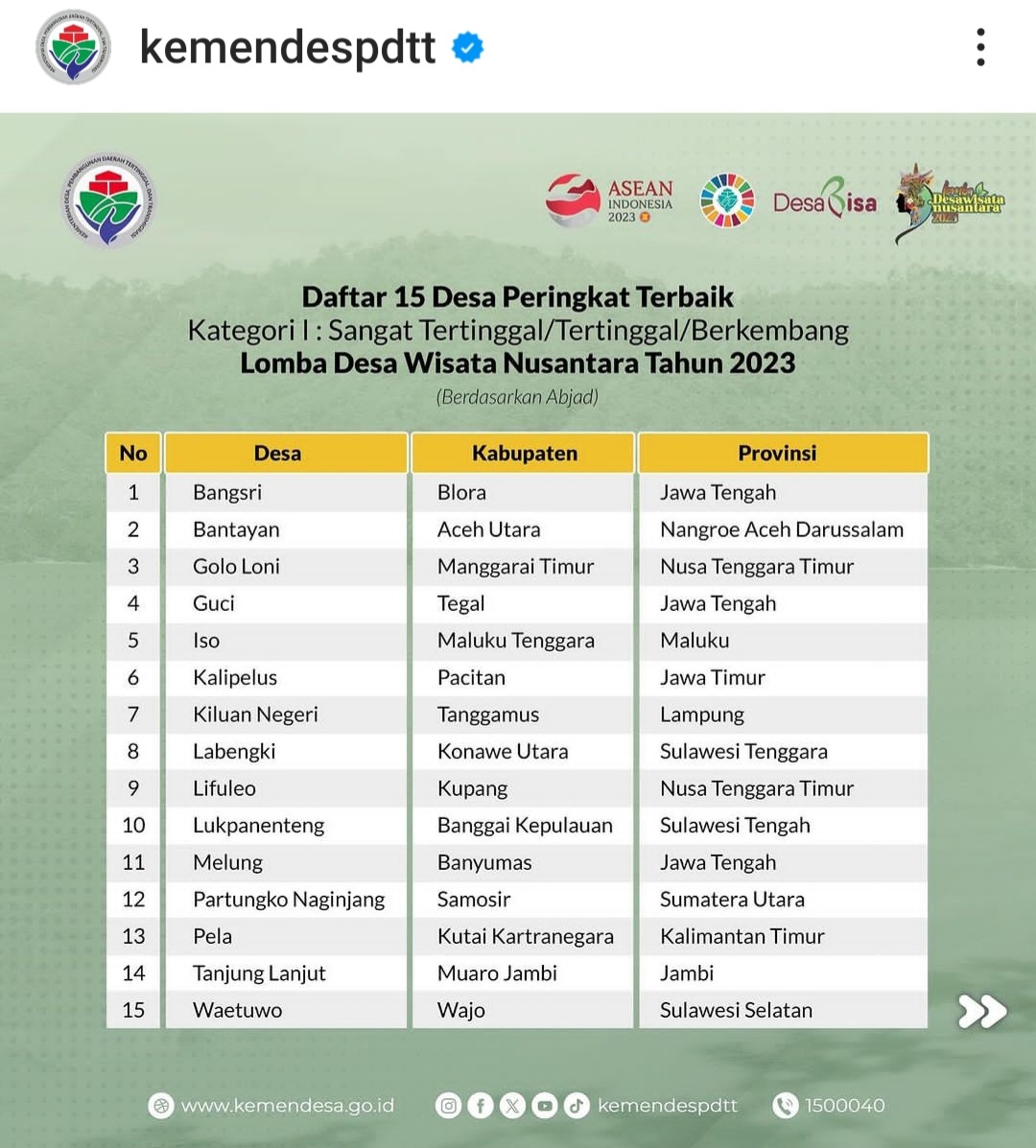 “Dalam pengumuman itu, Desa Bangsri masuk 15 besar kategori 1. Yakni yang terdiri dari desa-desa yang digolongkan sangat tertinggal, tertinggal, dan berkembang,” imbuhnya.