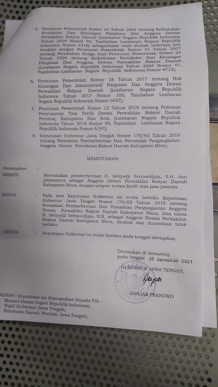 “Pada saat Keputusan Gubernur ini mulai berlaku Keputusan Gubernur Jawa Tengah Nomor 170/63 Tahun 2019 tentang peresmian pemberhentian dan peresmian pengangkatan anggota DPRD Kabupaten Blora, atas nama Setiyadji Setyawidjaja sebagai anggota DPRD Kabupaten Blora dicabut, dan dinyatakan tidak berlaku,” bunyi surat tersebut, Kamis (6/1/2022).