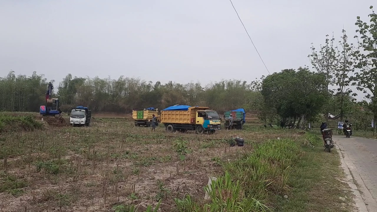 Berdasarkan pantauan di lokasi, setidaknya terdapat lima truk yang siap menampung tanah tersebut untuk diantarkan ke sebuah pabrik yang berada di Desa Kamolan.
