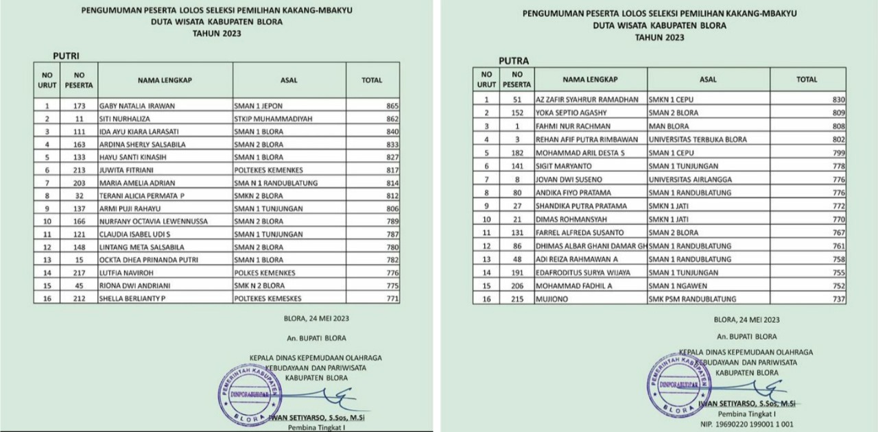 Daftar pengumuman peserta yang lolos seleksi pemilihan Kakang Mbakyu DUTA WISATA Kabupaten Blora Tahun 2023, sudah terbit.