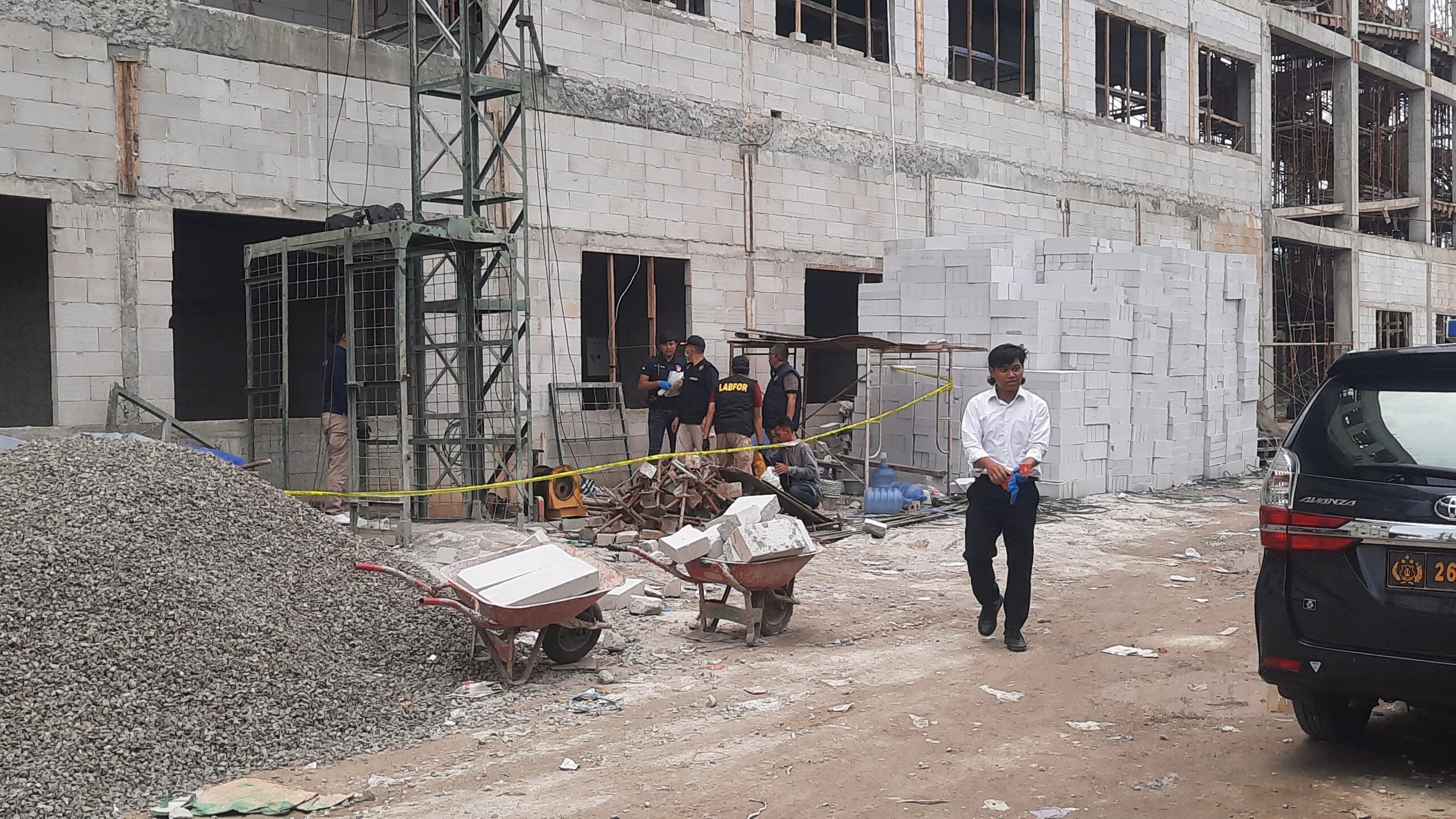 Selama proses penyelidikan, pihak kepolisian tetap memasang garis polisi dan menghentikan sementara proyek pembangunan gedung yang telah berlangsung sekitar enam bulan tersebut.